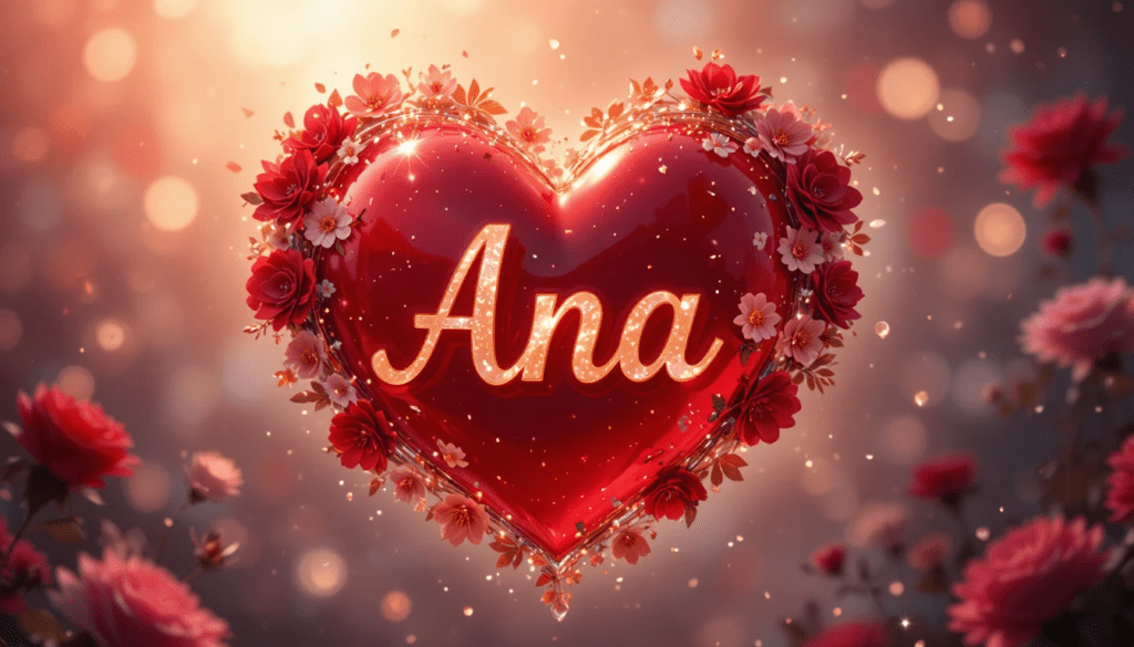 Ilustración romántica estilo realista de un corazón brillante con el nombre “Ana” en letras doradas, flores rojas y rosadas, luz cálida, fondo suave, atmósfera de amor, alta resolución.