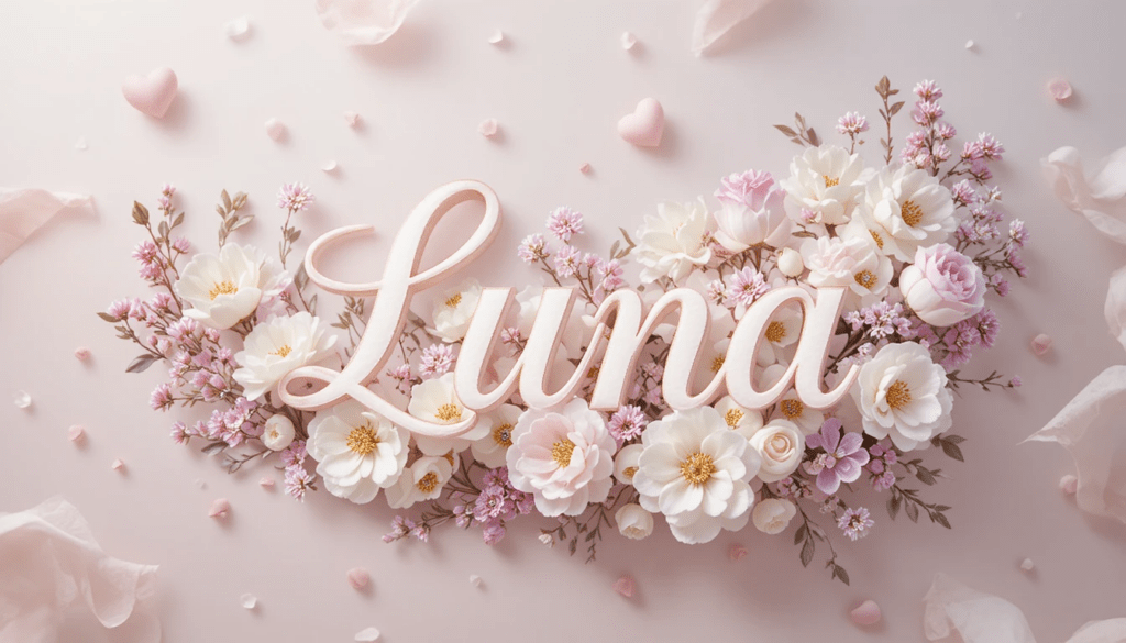 Diseño delicado con el nombre “Luna” en tipografía elegante color blanco, corazones suaves, flores blancas y lilas, adornos brillantes sutiles, fondo rosado claro, atmósfera romántica.