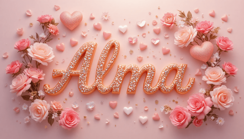 Imagen romántica con el nombre “Alma” en letras cursivas doradas, rodeado de corazones brillantes y flores rosadas, pétalos flotando, fondo pastel suave, iluminación cálida, estilo realista, alta resolución.
