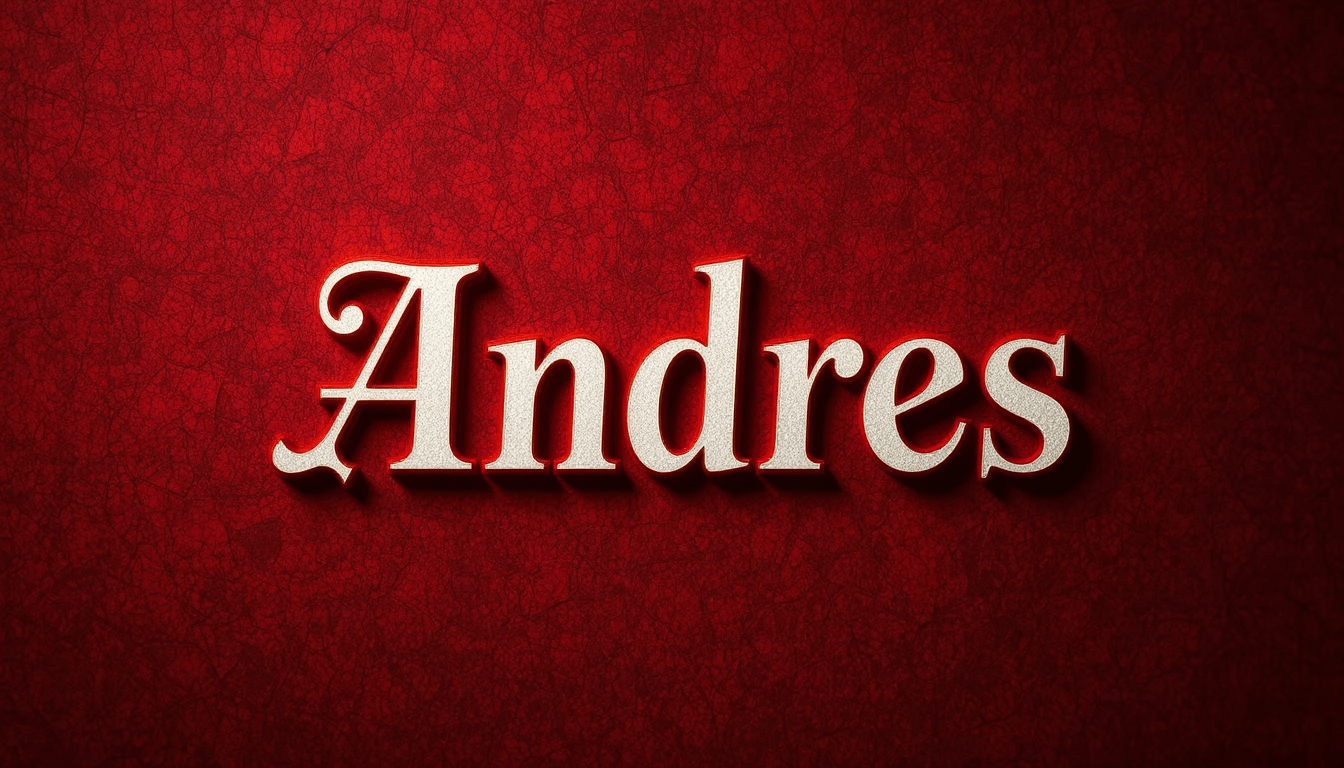 Nombre “Andrés” en tipografía elegante sobre fondo rojo intenso con textura de tela, iluminación romántica.