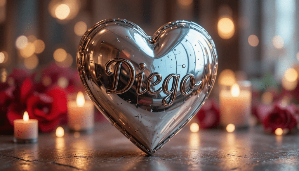 Corazón metálico con el nombre “Diego” grabado, fondo elegante, luces cálidas, estilo realista premium.