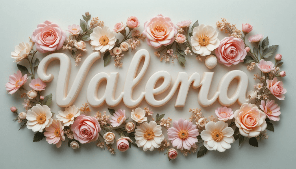 Nombre “Valeria” en letras cursivas rodeadas de flores de primavera, tonos pastel, estilo dulce, romántico y femenino.