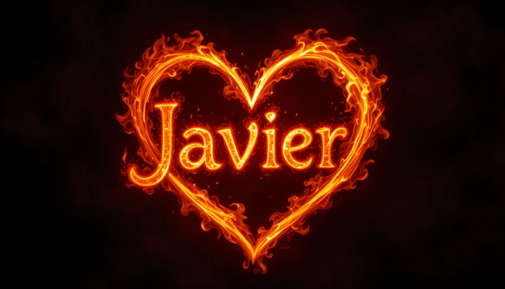 Imagen intensa con el nombre “Javier” en fuego suave formando un corazón, fondo oscuro, contraste alto, estilo artístico.