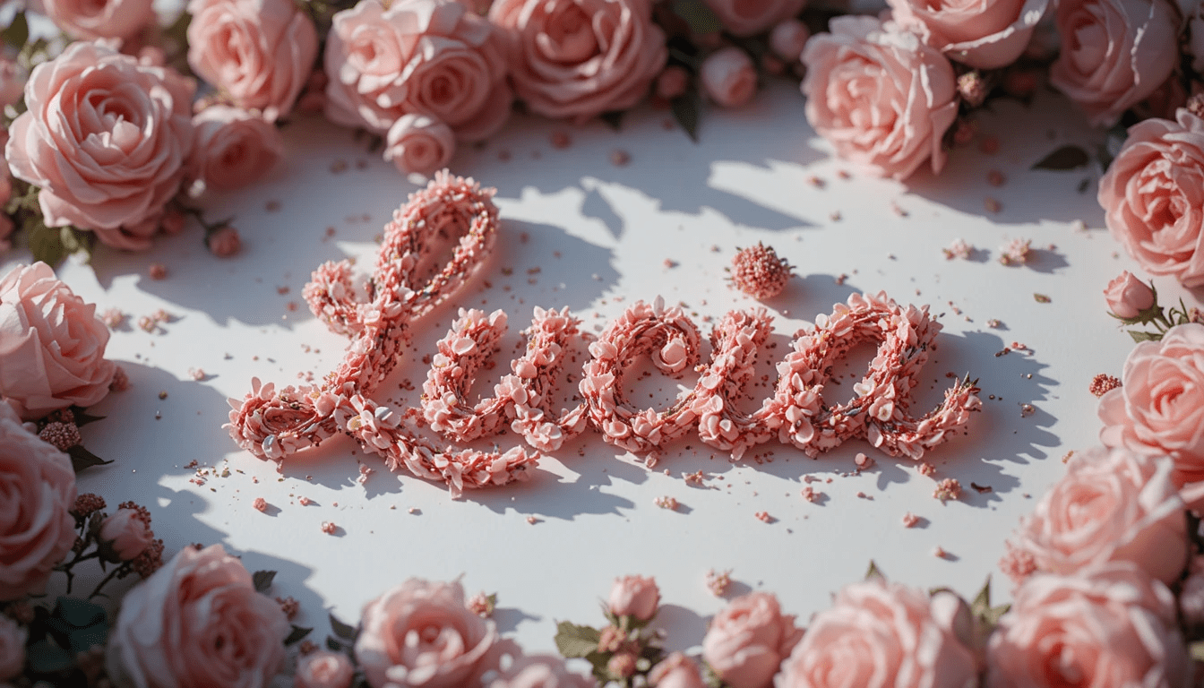 Ilustración delicada con el nombre “Lucía” escrito en flores rosadas, fondo blanco, luz natural, estilo romántico y tierno.