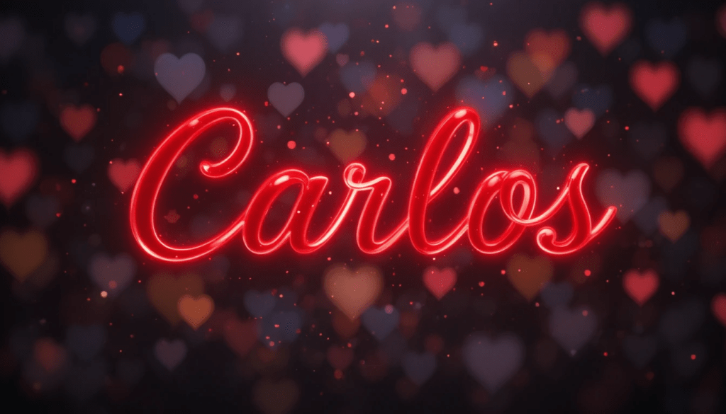 Diseño romántico con el nombre “Carlos” en neón rojo, fondo oscuro con luces bokeh, corazones luminosos, estilo moderno y elegante.
