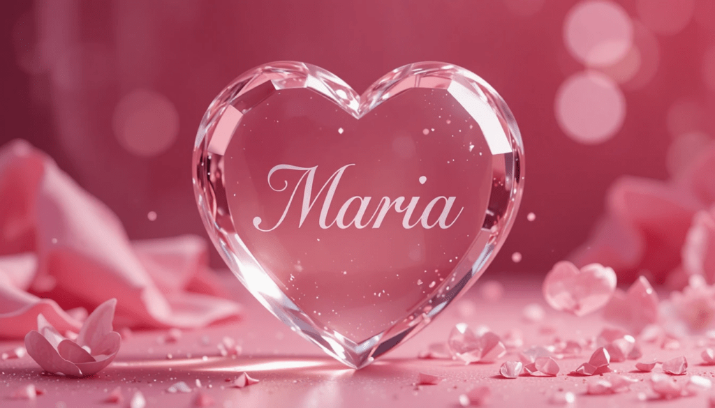 Corazón de cristal con el nombre “María” en caligrafía elegante, pétalos flotando, fondo rosado, estilo San Valentín, luz suave.