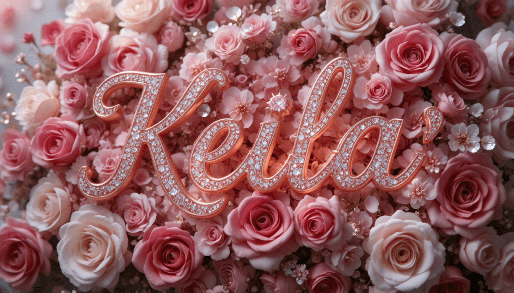 Imagen delicada y femenina con el nombre “Keila” en caligrafía elegante, corazones brillantes, flores rosadas y blancas, adornos románticos, iluminación suave, alta calidad.