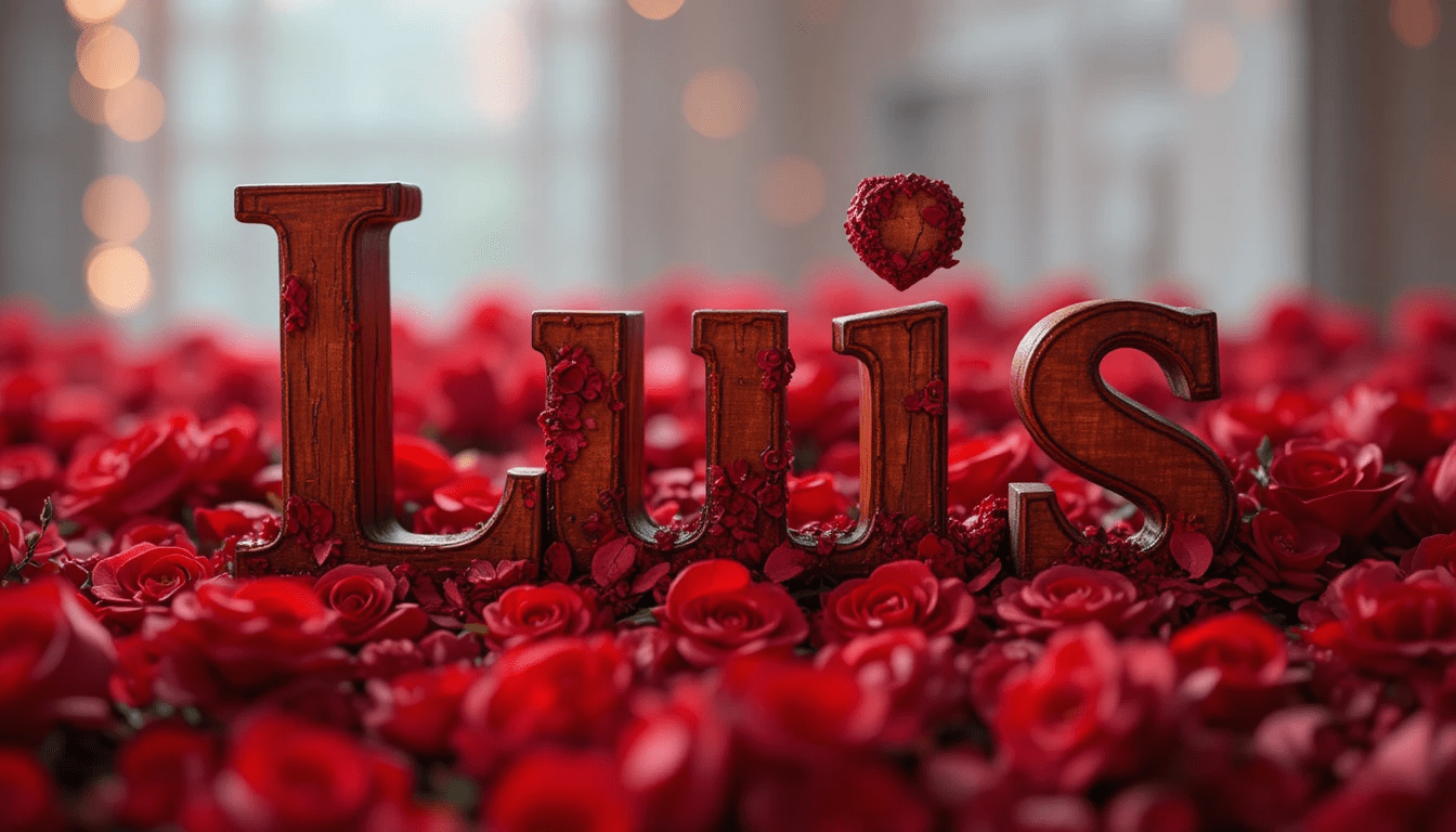 Imagen artística con el nombre “Luis” tallado en madera sobre un fondo de rosas rojas, iluminación cálida, estilo romántico, ultra realista.