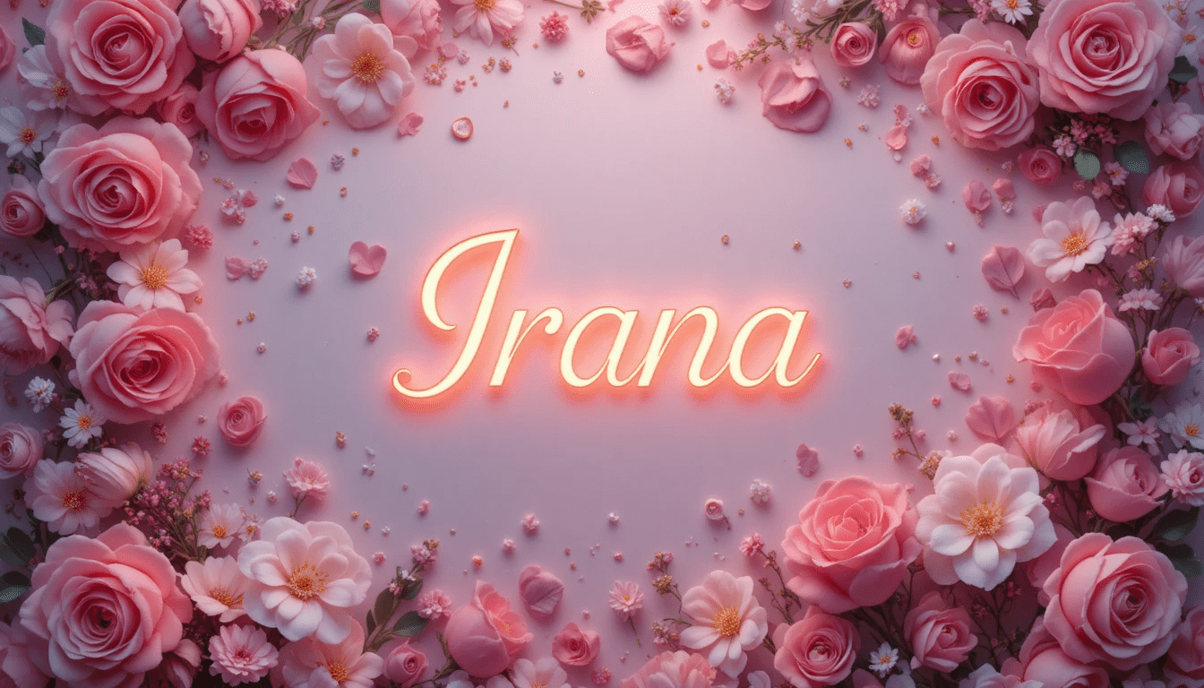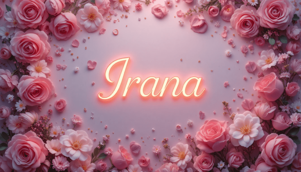 Diseño romántico con el nombre “Irana” centrado, rodeado de corazones rosados, flores delicadas, adornos luminosos, fondo pastel, estilo realista.