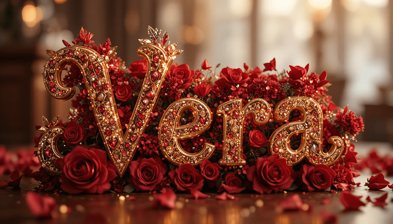 Imagen San Valentín con el nombre “Vera” en letras doradas, corazones decorativos, flores rojas intensas, detalles brillantes, fondo elegante con luz cálida.