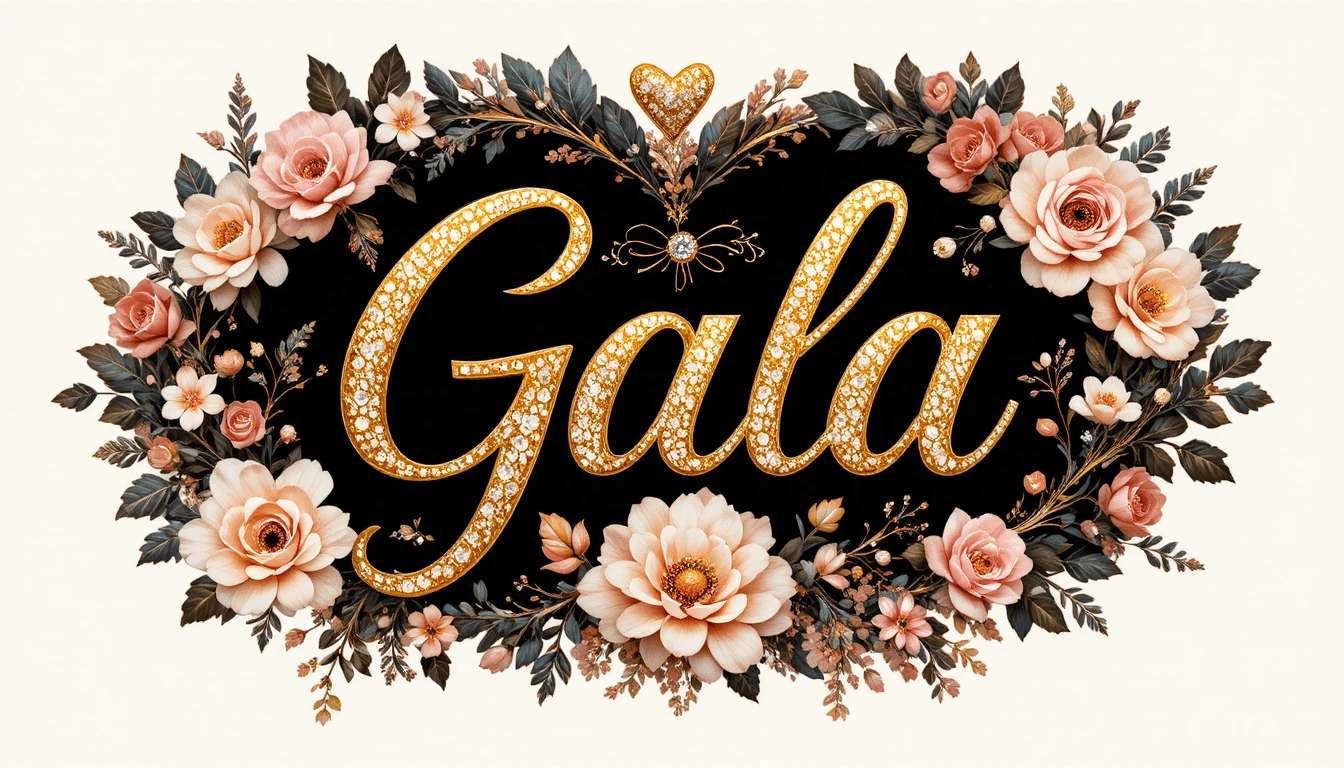Diseño artístico con el nombre “Gala” en tipografía moderna, corazones brillantes, flores color crema y rosadas, adornos elegantes, fondo claro, estilo editorial romántico.