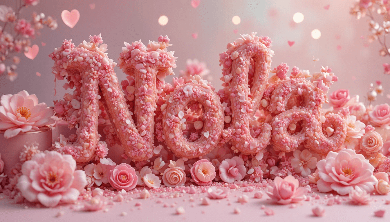 Imagen dulce con el nombre “Nola” en letras rosadas, corazones flotantes, flores delicadas, fondo pastel, luz suave, estilo tierno y romántico.