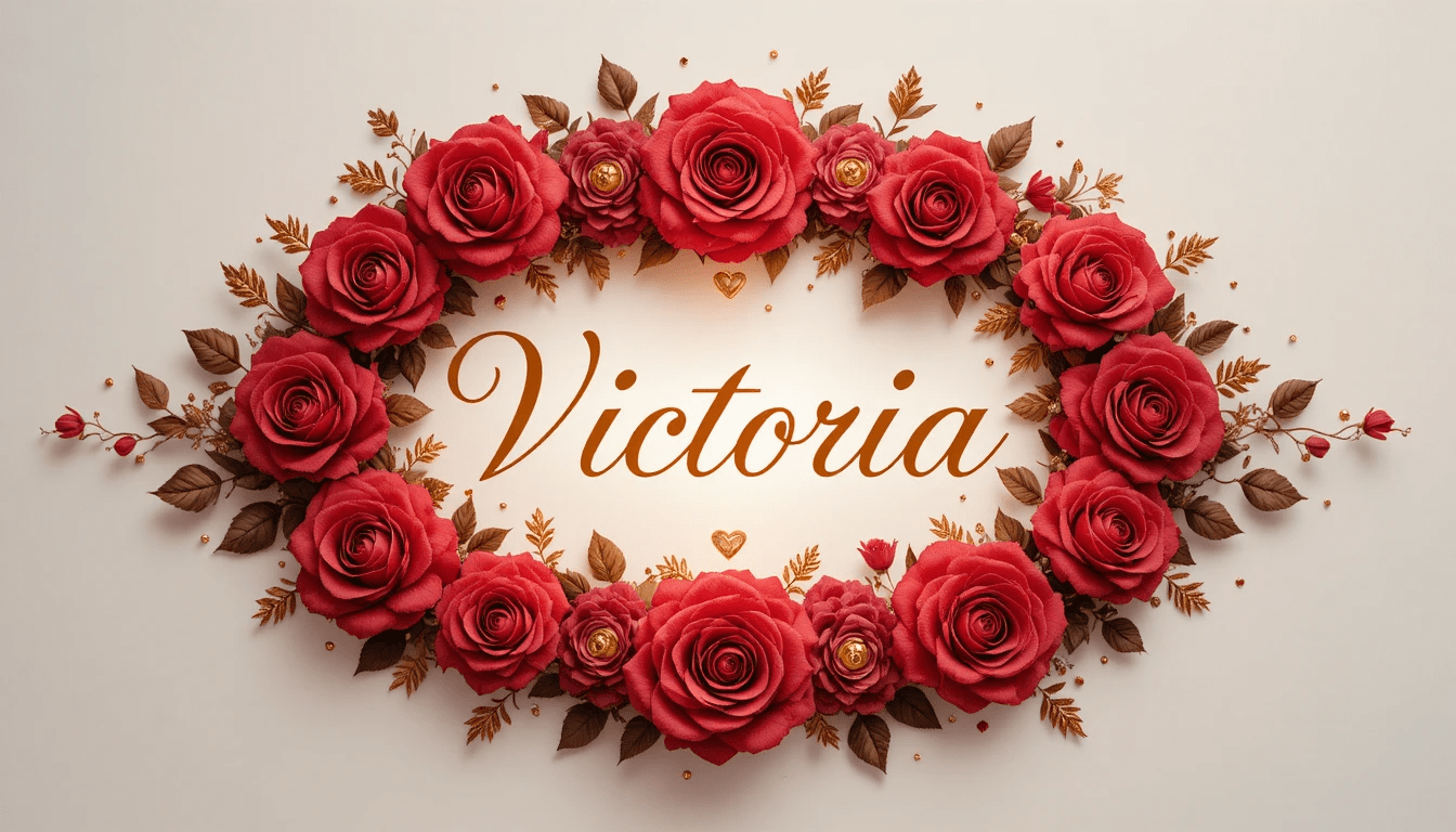 Ilustración elegante con el nombre “Victoria” en caligrafía fina, rodeado de rosas rojas, corazones pequeños dorados, adornos románticos, iluminación cálida, estilo premium.