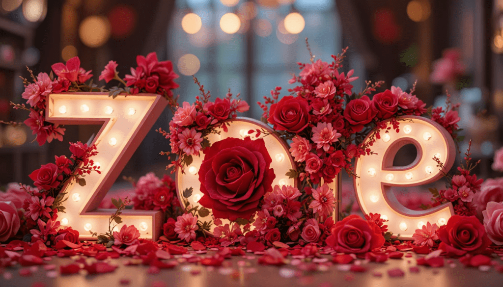 Imagen moderna y romántica con el nombre “Zoe” en letras luminosas, corazones decorativos, flores rojas y rosadas, detalles brillantes, fondo desenfocado, estilo San Valentín.